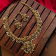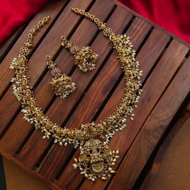 Antique finished 3D peacock design and goddess lakshmi with rice pearl drops haram set with jhumka.