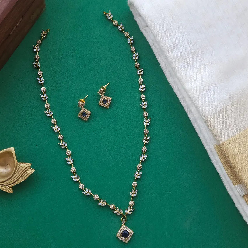 Antique gold finish american diamond floral leafy design white and purple block stone party wear long haram set with earrings.