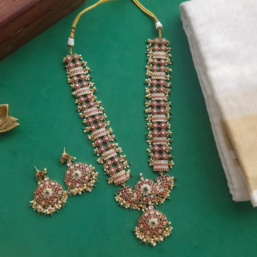Antique gold finished peacock and floral designed heavy kemp stone worked cluster pearl traditional guttapusalu haaram with earrings.