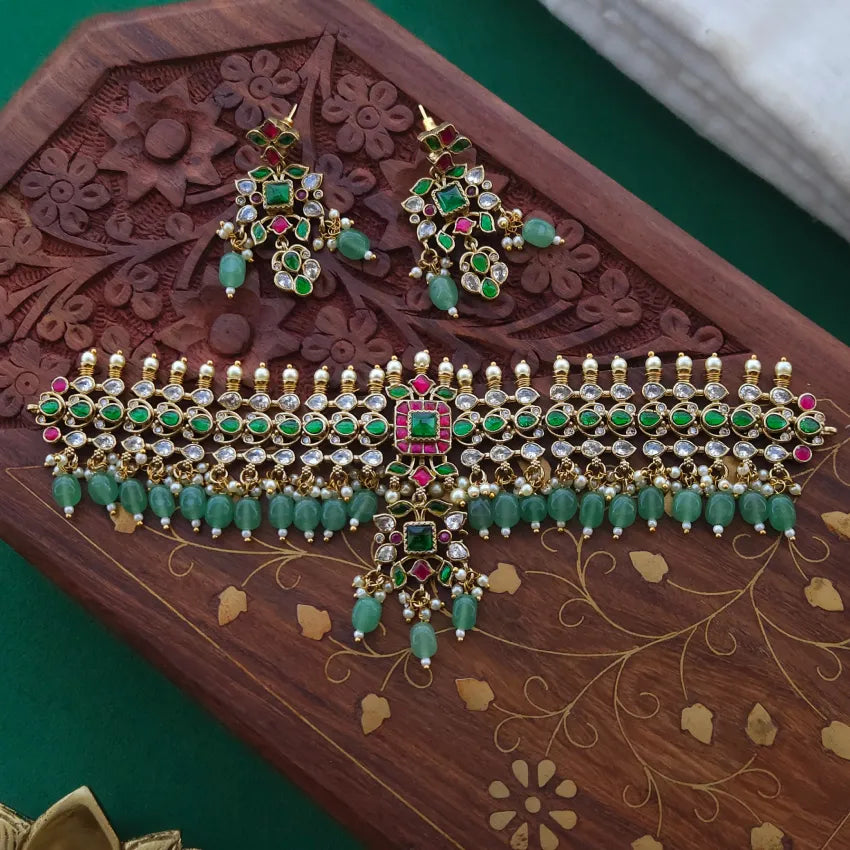 Antique gold-finished jadau statement high neck choker set with mint green beads comes with chandballi earrings.
