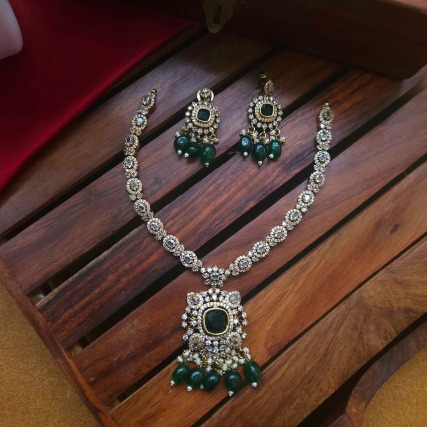Victorian finish American diamond elegant stone with bottle green monalisa beads hanging neckpiece set with earrings.