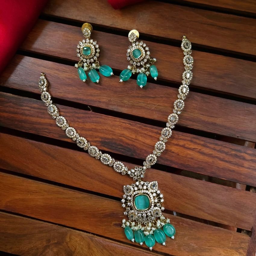 Victorian finish American diamond elegant stone with turquoise blue monalisa beads hanging neckpiece set with earrings.
