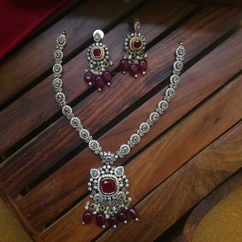 Victorian finish American diamond elegant stone with wine red monalisa beads hanging neckpiece set with earrings.