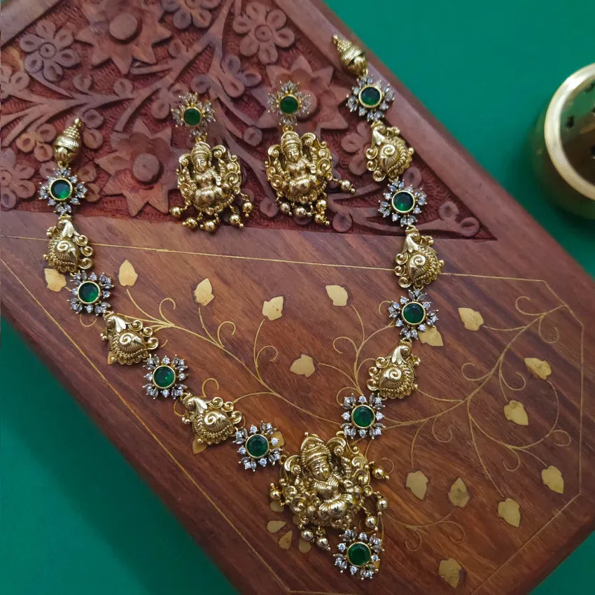 Antique gold finished real gold inspired goddess Lakshmi and peacock designed green block stoned floral designed neckpiece set with earrings.