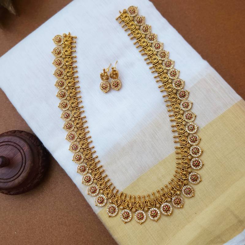 Matt gold finish floral with peacock pattern long haram comes with earrings.