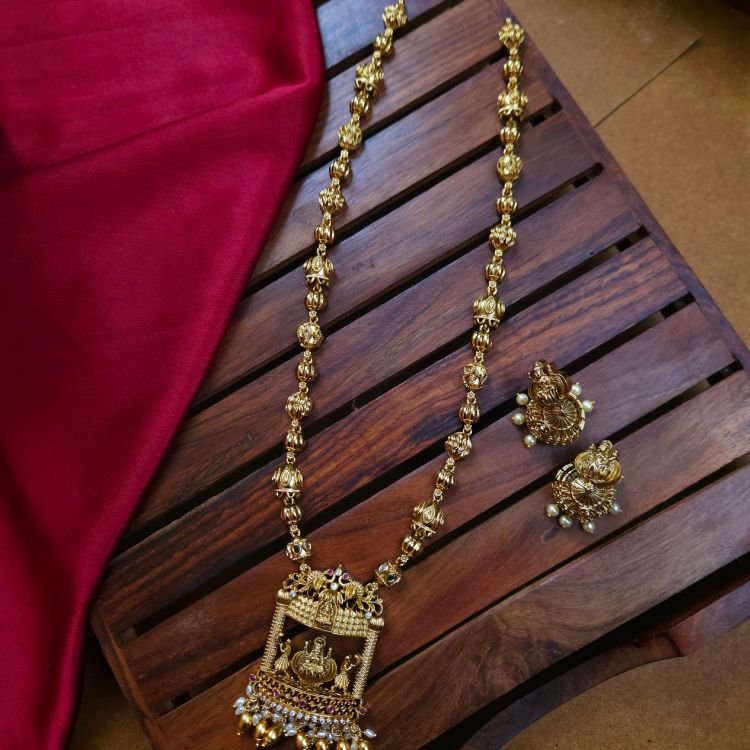 Antique gold finish beautiful temple designer pendant haram set with jhumka.