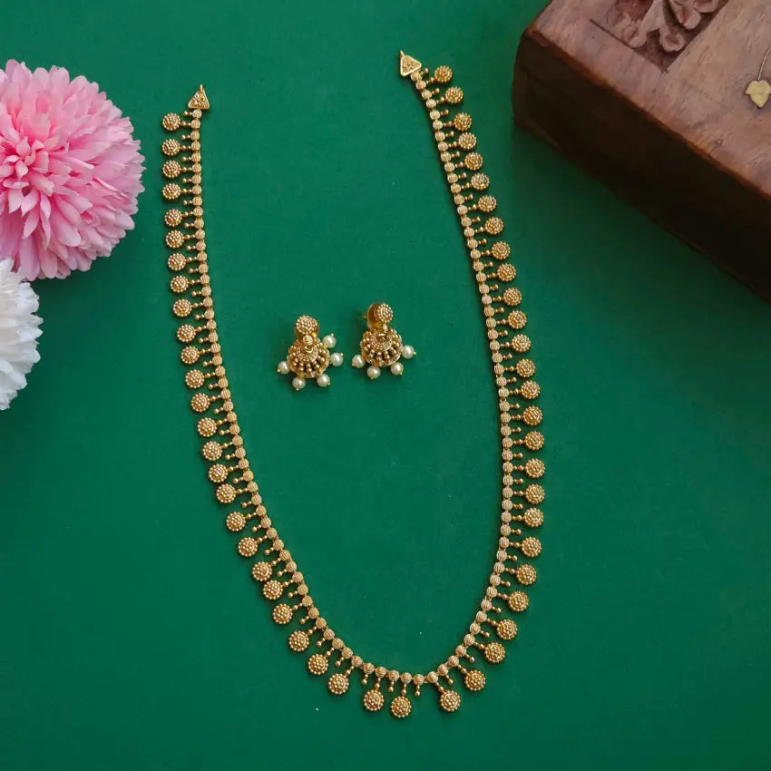 matte gold finished butta designed haram comes with a pair of jhumka.