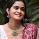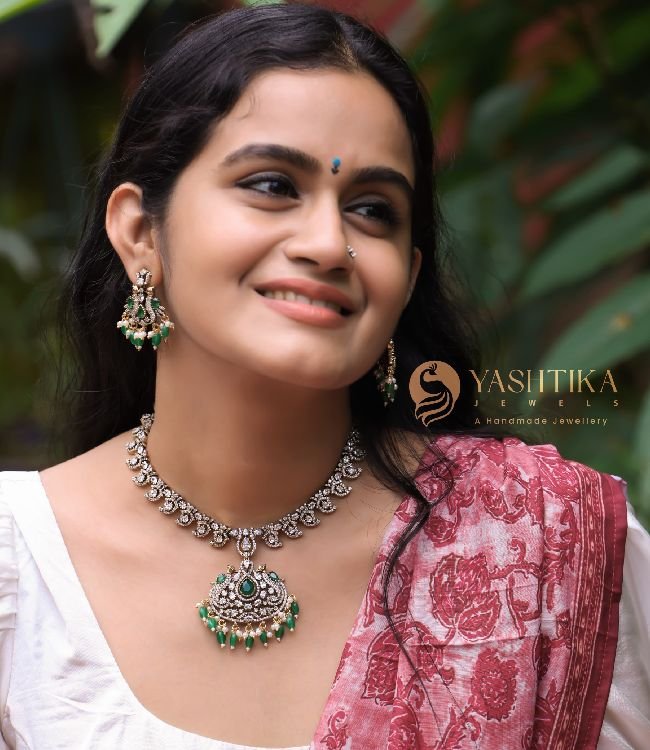 Victorian finish manga design exquisite AD stone work unique Indo western guest look neckpiece set with earrings.