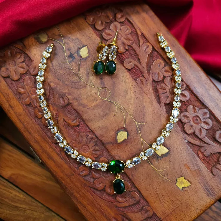 Antique gold finish shimmering AD white and Green block stone necklace set with earrings.