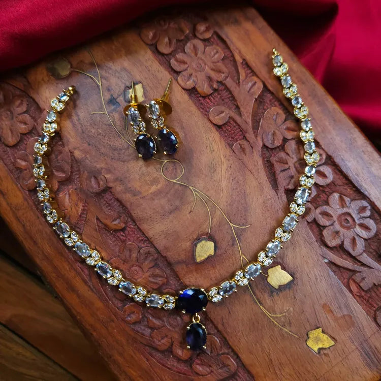 Antique gold finish shimmering AD white and purple block stone necklace set with earrings.
