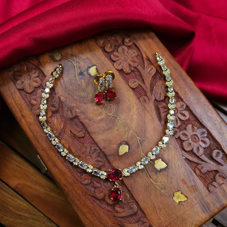 Antique gold finish shimmering AD white and red block stone necklace set with earrings.