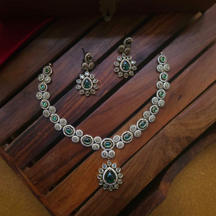Victorian finish American diamond elegant green and white stone work beautiful guest look neckpiece set with earrings.
