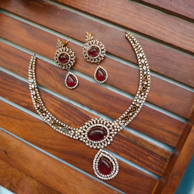 American Diamond red with white stone neck hugging party wear neckpiece with a earrings.