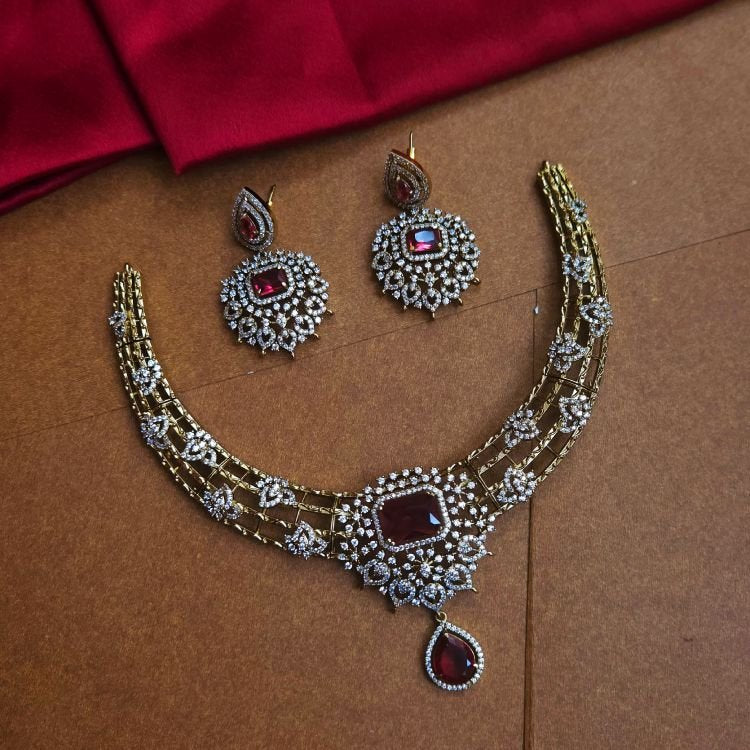 American Diamond victorian finished maroon and white diamond replica design work neckpiece set with earrings.