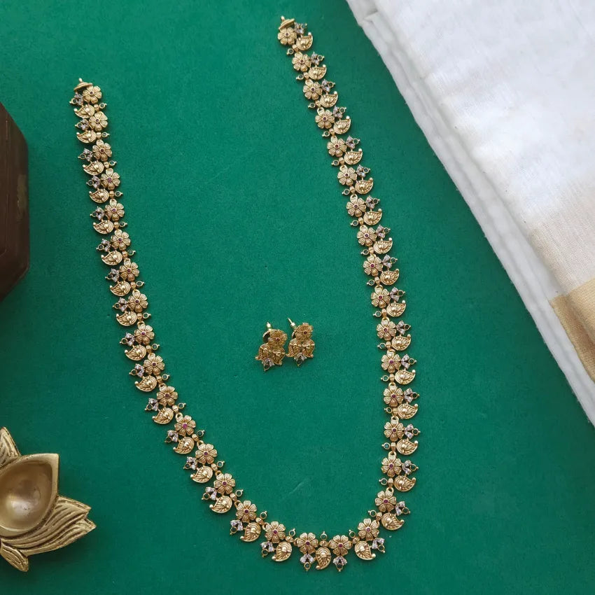 Antique matte gold finish floral and mango designed long haram set with earrings.