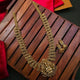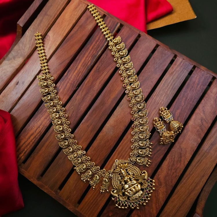 Antique black gold finish goddess Lakshmi and peacock design temple designer bridal long haram set with jhumkas made in brass.