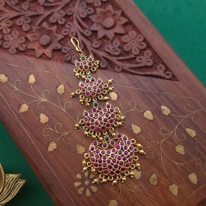 Antique gold finish layered kemp stones worked bridal maang tikka.