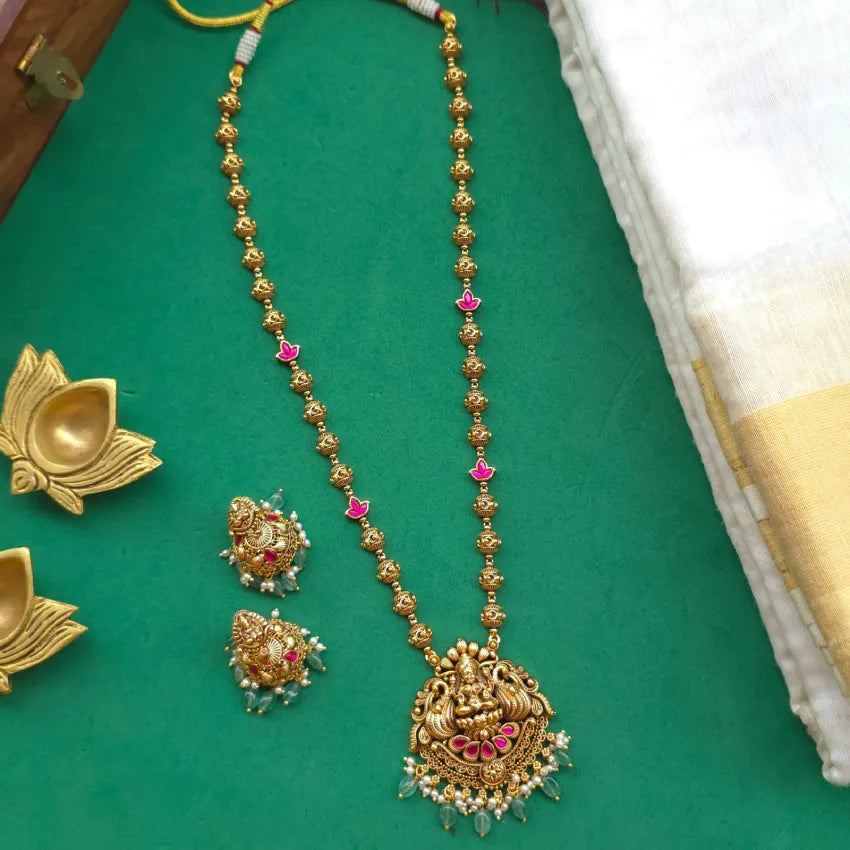 Antique gold finish Goddess Lakshmi with Jadau long haram set with mint green beads and jhumkas.