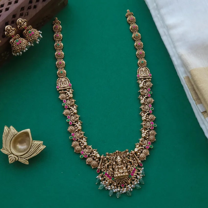 Antique gold-finished goddess Lakshmi elephant with floral designed jadau stones long `bridal haram set with jhumka.