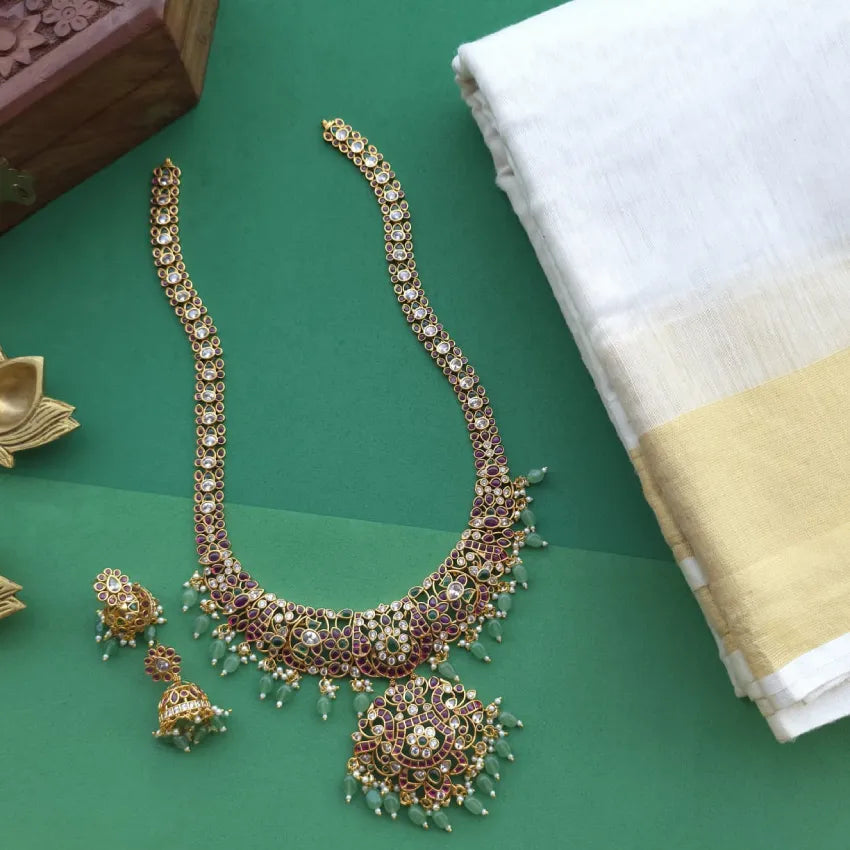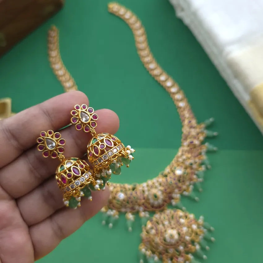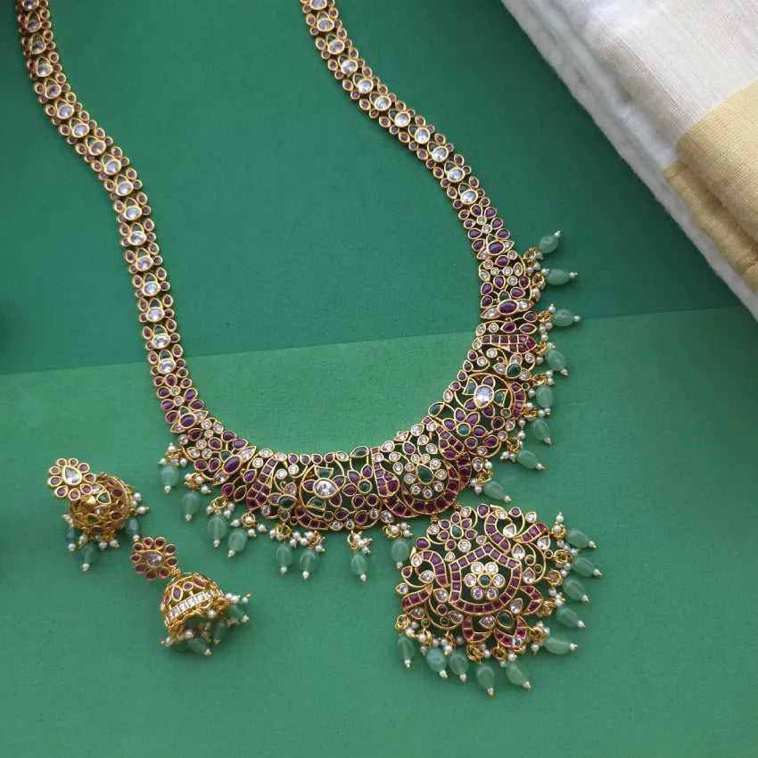 Antique gold finish premium kemp stones peacock design haram set with strawberry beads and jhumka.