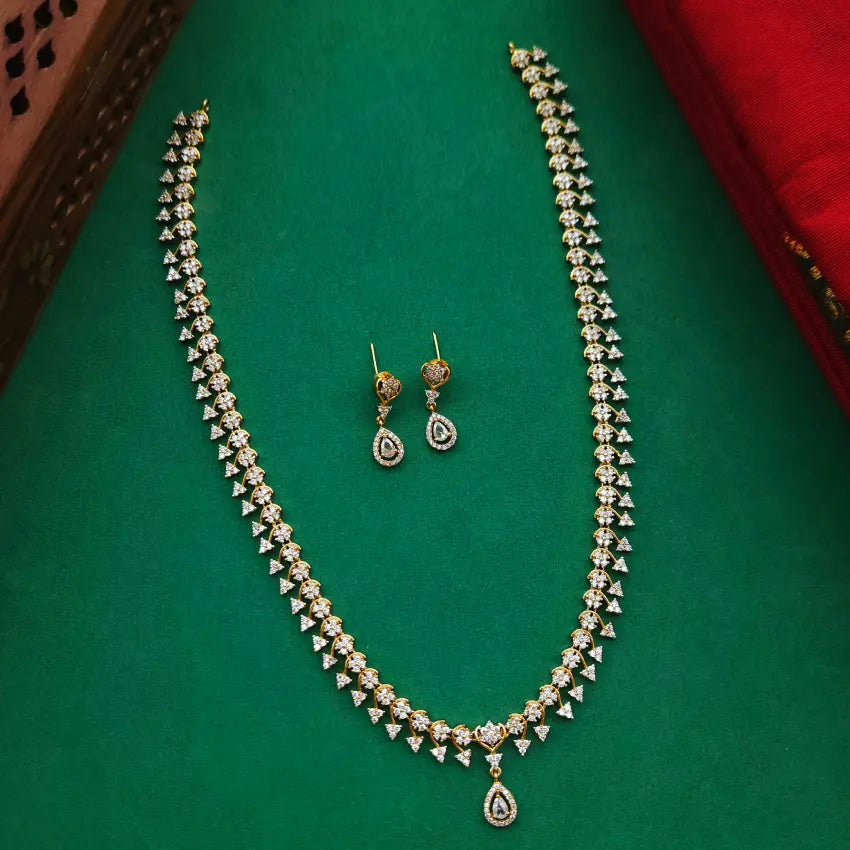 American Diamond nakshatra designed grand full white stone long haram set with earrings.