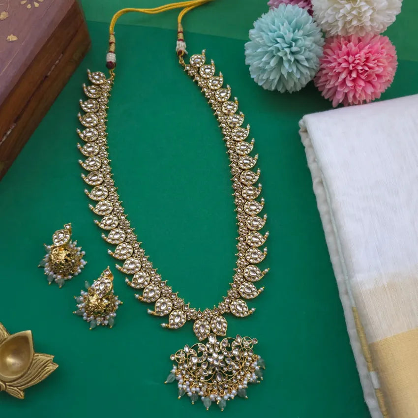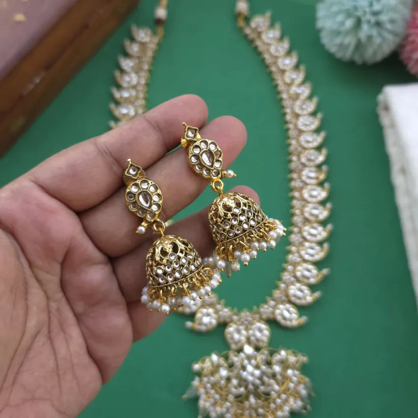 Antique gold finish premium manga design kemp stone worked bridal haram set with jhumka.