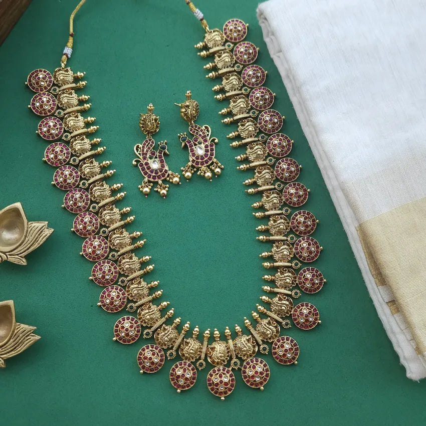 Antique gold finish real gold inspired 3D peacock designed real kemp stone bold haram set with earrings.