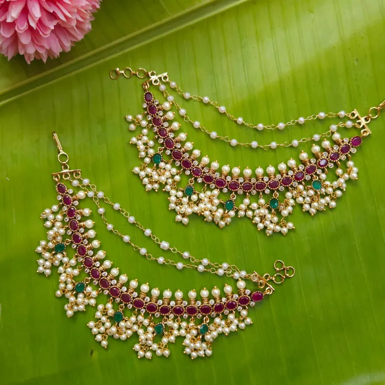 Antique gold finish real gold replica premium kemp stones tri layered guttapusalu bridal earchain/mattal.