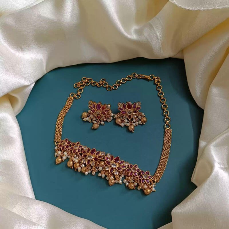 Matte gold finished kemp stoned lotus designed cluster pearl and golden beads hanging high neck hugging chocker, comes with a pair of earbuds.