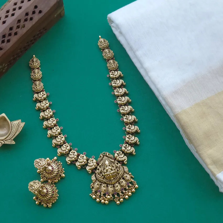 Antique gold finish real gold inspired goddess Lakshmi 3D nagasi designed weightless bridal haram set with jhumka.