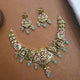 Antique gold matte finish goddess lakshmi with peacock design beautiful 3D pattern and elegant jaadu and white stone work bridal neckpiece set with earrings.