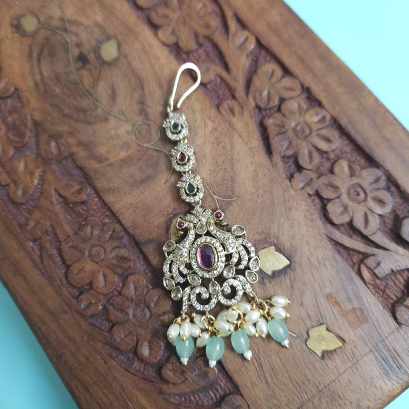 Victorian-finish ad stone with monalisha beads bridal tikka.