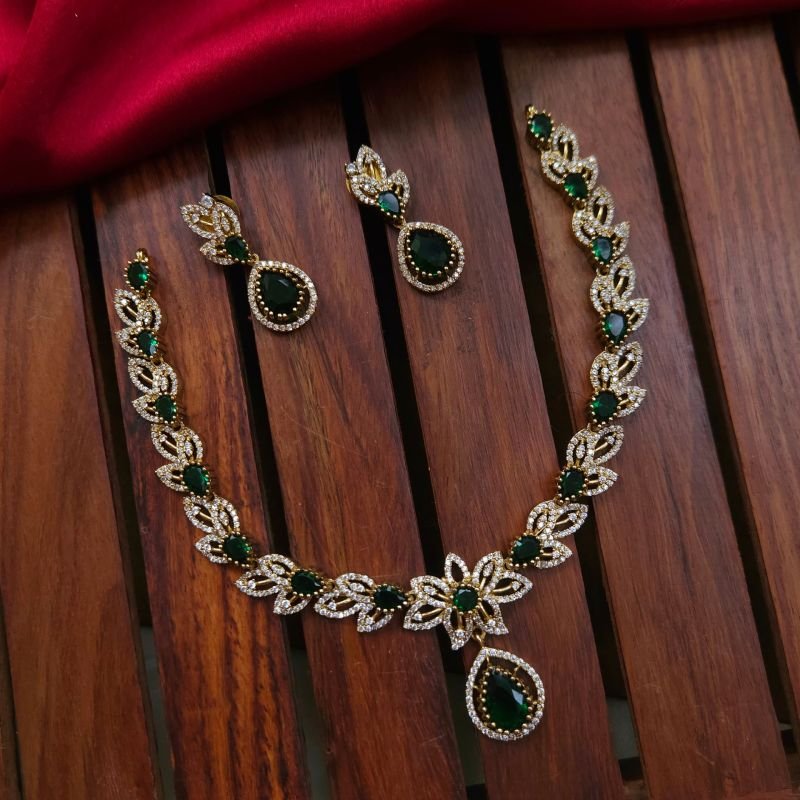 Antique gold finish american diamond floral design Green block stone neckpiece set with earrings.