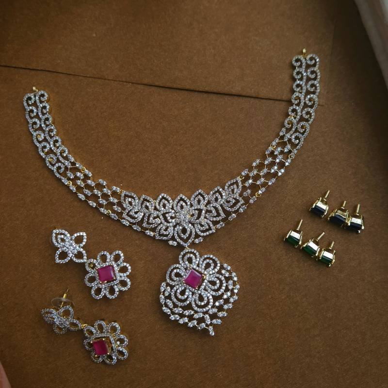 American Diamond gold finished exquisite stone worked 3 in 1 different color (Ruby, Blue, Green) changeable neck piece set perfect for Guest look party wear.